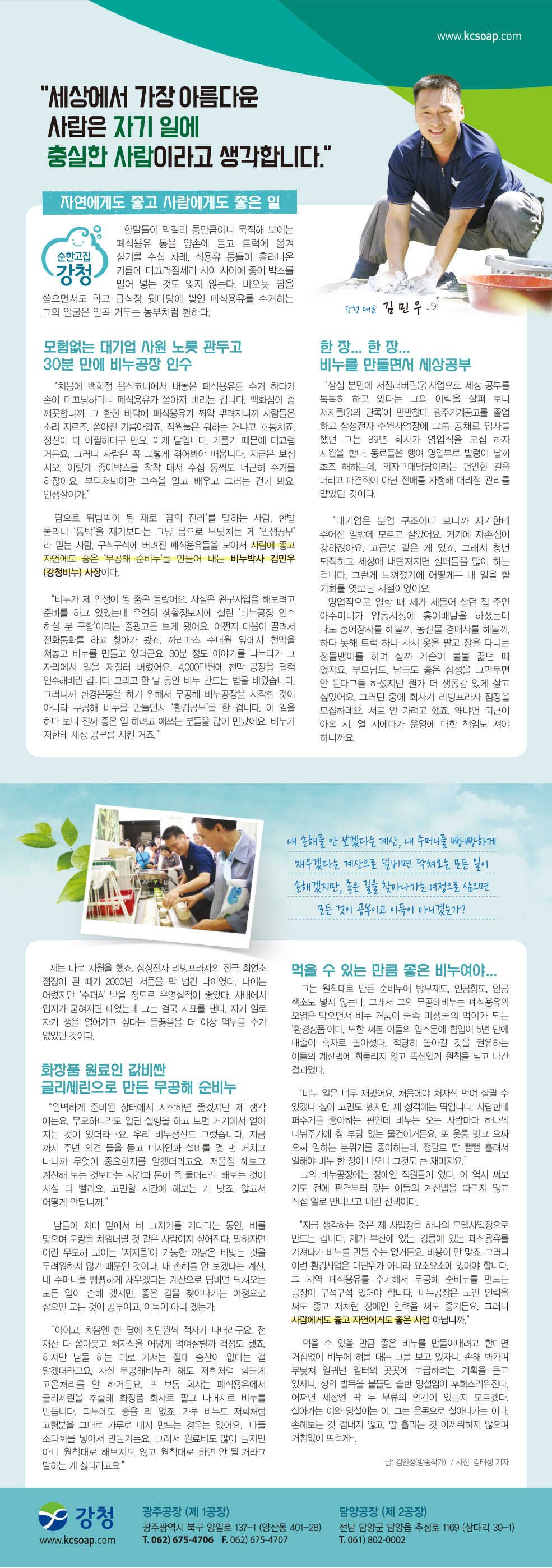 | 소개 | -강청은 2002년에 설립하여 폐식용유를 재활용하여 비누및 세제를생산합니다 -합성계면활성제,방부제,인공생소등은 첨가하지 않습니다. -고형/분말/액상형태를 생산할수 있는 설비를 모두 갖추고 있습니다. | ||
