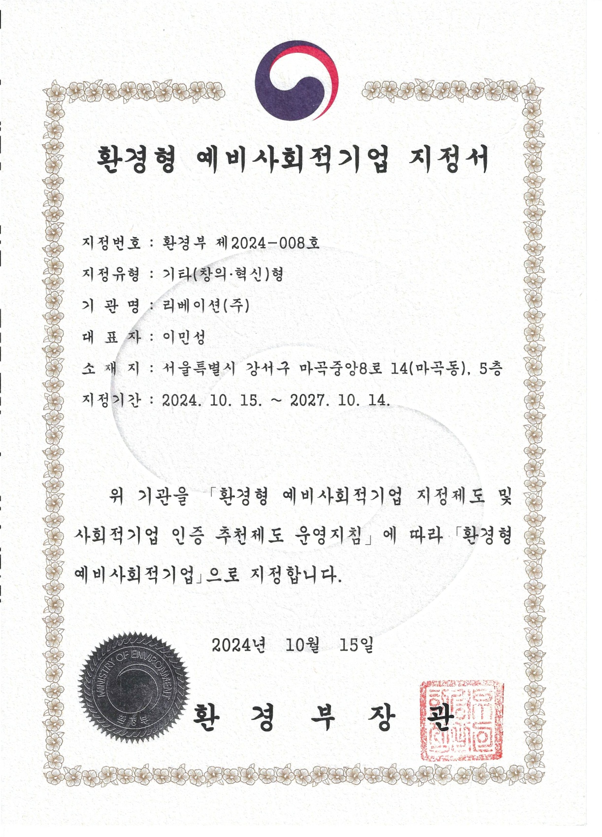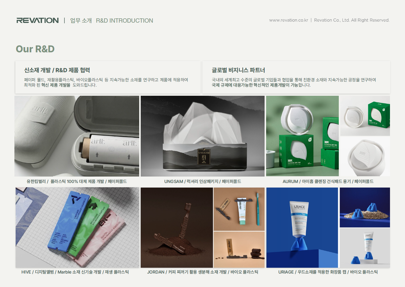 | 소개 | 친환경 패키지 원스톱 솔루션 기업인 리베이션(주)은 B2B를 대상으로 디자인컨설팅부터 친환경 제품개발, 생산 납품하는 기업입니다. 탄소절감이 가능한 친환경 기술을 기반으로 플라스틱을 완전대체하는 제품과 패키지를 제시하여 제품의 수명 주기가 끝난 후에도 자연으로 돌아갈 수 있습니다. 리베이션(주)는 제품과 서비스의 고부가가치화 및 자원의 선순환화에 앞장서고 있습니다. | ||